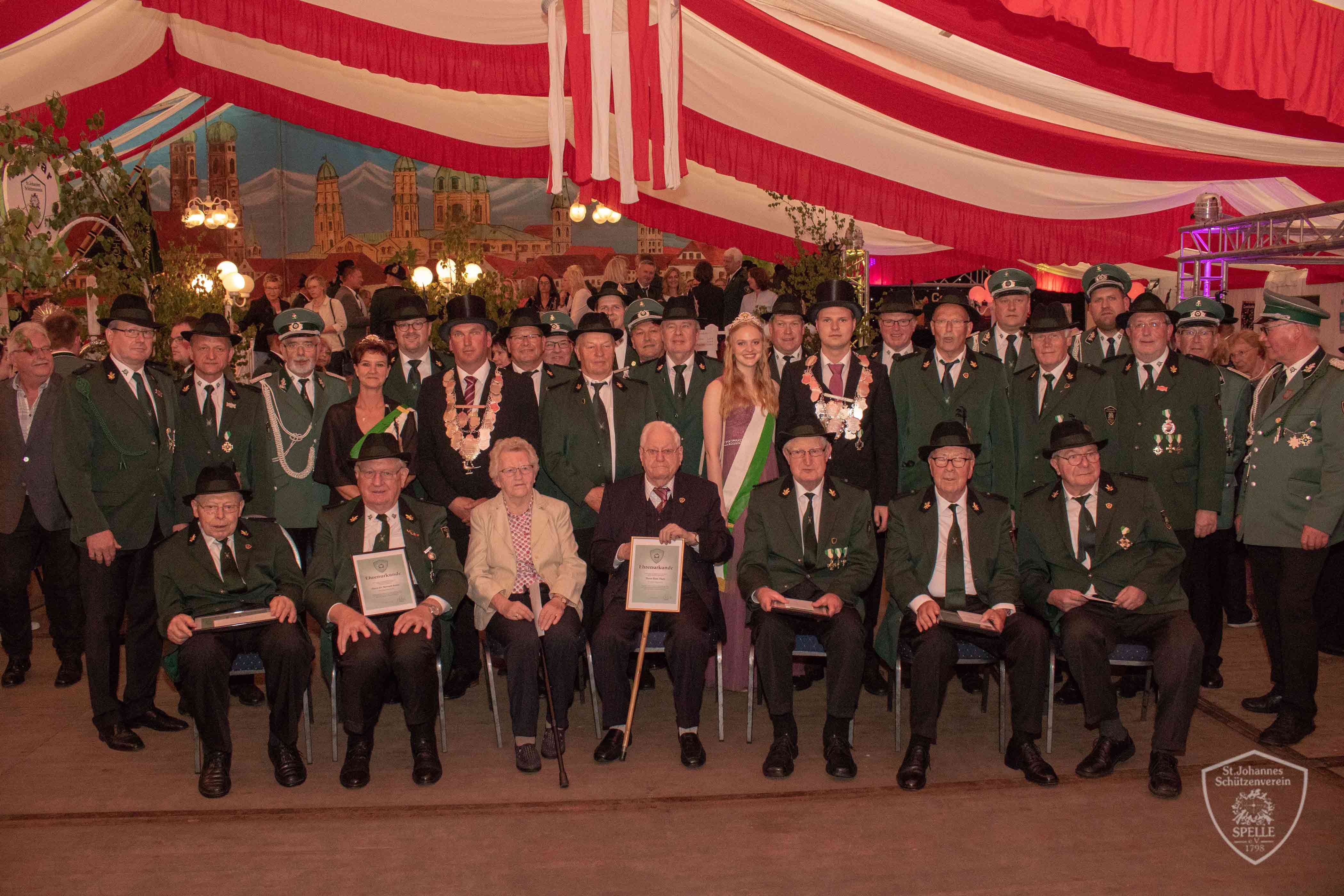 Auf dem diesjährigen Schützenfest konnte der 1. Vorsitzende Ludger Gude elf Schützenbrüder für 70-, 60- und 50-jährige Vereinszugehörigkeit ehren. Ein besonderes Jubiläum feierte in diesem Jahr das älteste Vereinsmitglied Hans Thale, der auf eine 70-jährige Mitgliedschaft zurückblicken kann. Er trat 1948 in den Schützenverein ein und konnte daher viele Geschichten und Begebenheiten aus dieser langen Zeit erzählen. Ludger Gude dankte dem 96-jährigen Hans Thale für die langjährige Verbundenheit und freute sich besonders, dass der Jubilar persönlich mit seiner Frau Emma unter großem Beifall der Schützenbrüder und der Speller Bevölkerung die Ehrung entgegennehmen konnte.